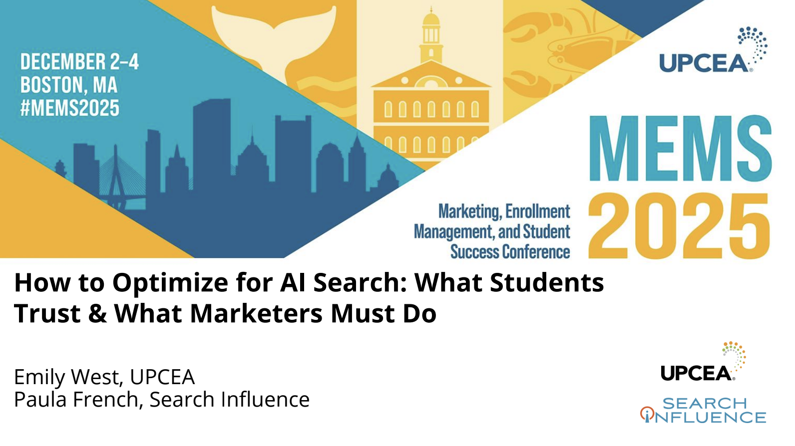 As AI continues to redefine how students search for and engage with academic programs, marketers are rethinking how they track, measure, and optimize online visibility. This December, Search Influence will share actionable AI search strategies for higher education at the 2025 UPCEA Marketing, Enrollment Management, and Student Success (MEMS) Conference, …