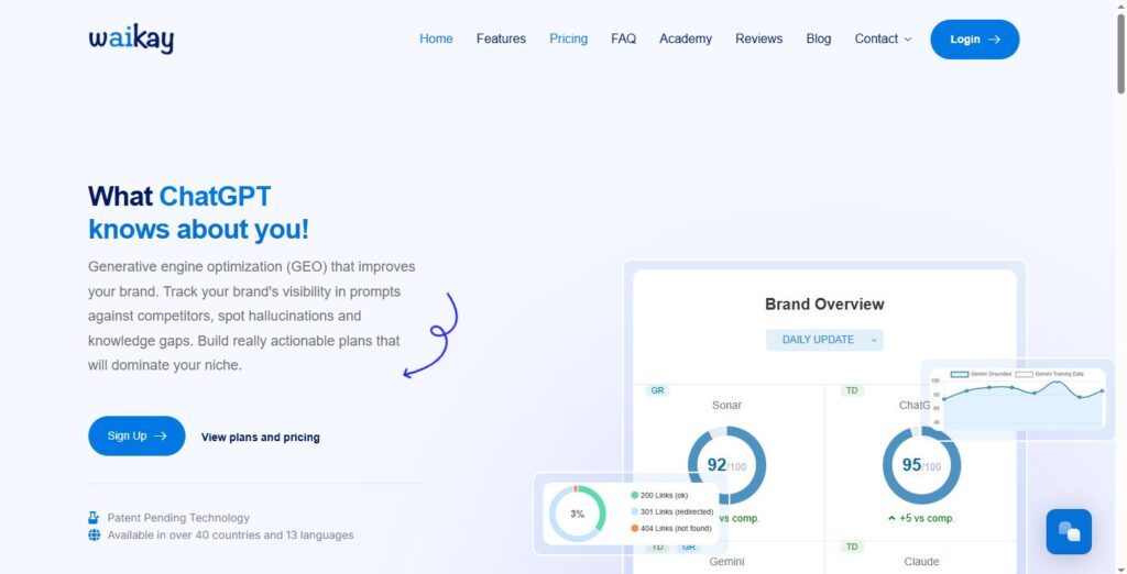 | Waikay.io | $69.95/month | ChatGPT, Google Gemini, Claude, Perplexity | On-demand, report-based | Listed on G2, currently no public reviews | Entity-based, knowledge-graph-driven AI Brand Score and hallucination detection | Brand perception monitoring and entity-level AI analysis |