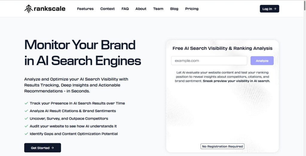 RankScale positions itself as an analytical tool for “geeky minds,” using a flexible credit-based system that starts at about $20/month for 120 credits. This model allows teams of any size to experiment with AI search visibility while controlling costs.