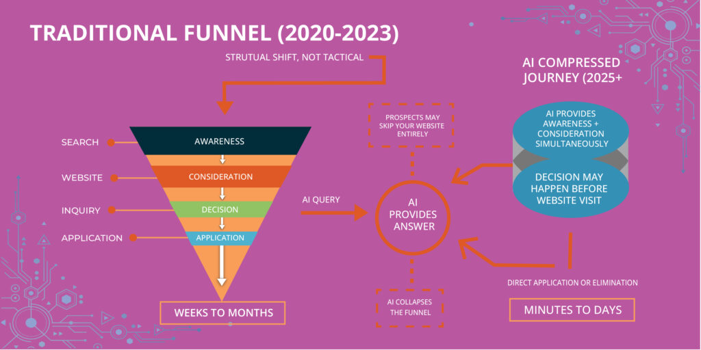 Website traffic and click-through rates don’t capture AI-mediated discovery. Brand visibility and AI citation frequency matter, but most institutions aren’t tracking them yet.