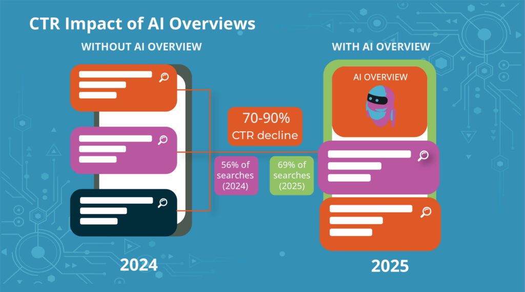 As of May 2025, roughly 69% of Google searches end without a click to any website, up from 56% a year earlier. When AI Overviews appear, click-through rates to top-ranking websites decline by 70-90%.