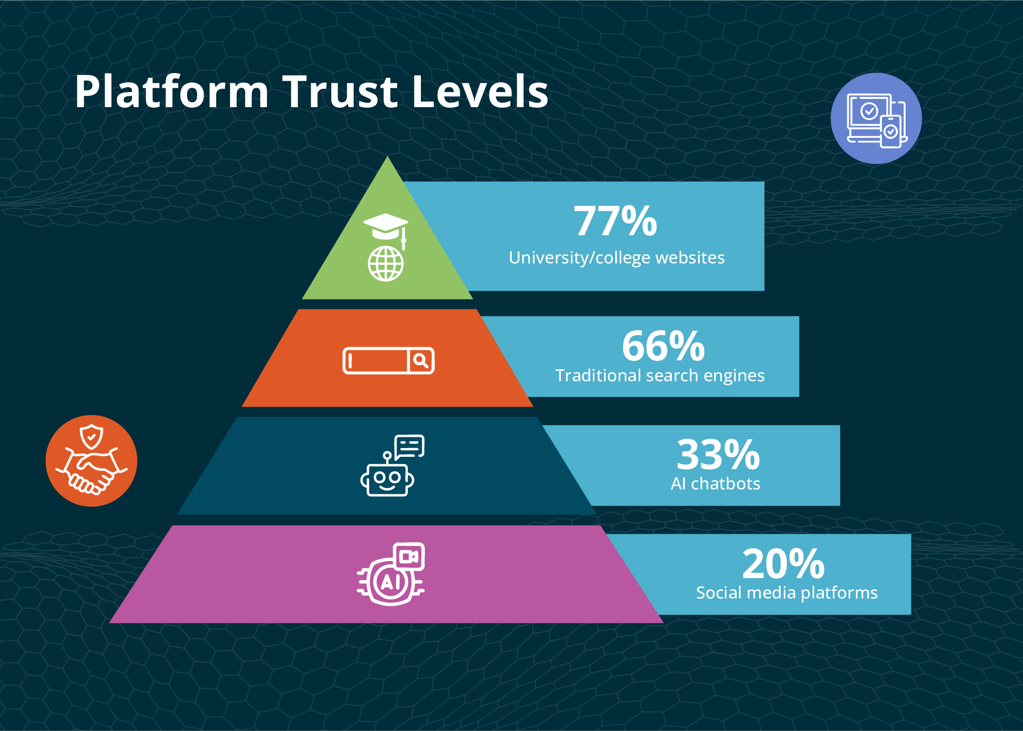 University websites are still the most trusted source by a wide margin. That’s actually good news for 2026. While AI tools are gaining usage, the destination of trust remains institutional websites. The challenge is making sure AI tools surface and cite your content accurately—so prospects who trust AI still end up trusting you.